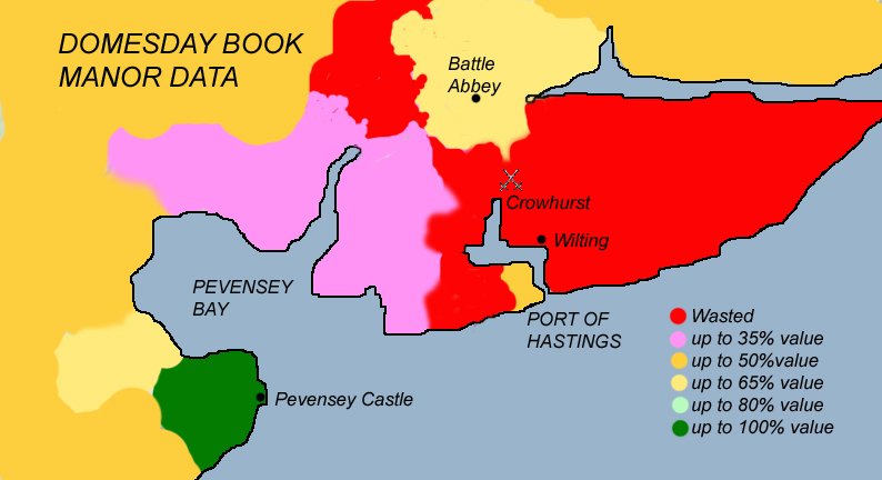 Now with other data we can see why Domesday throws up these otherwise inexplicable anomalies and why no-one else since records began has a logical explaination of the values. We know that Wilting was the most wasted manor, because it was the camp site of William the Conqueror and therefore took the greatest raveging from the Norman army. Crowhurst on the other hand was owned by Harold and whilst it had a greater population than Wilting at the start it can only have been totally destroyed by the battle of Hastings, which took place at the time of the Norman Invasion.