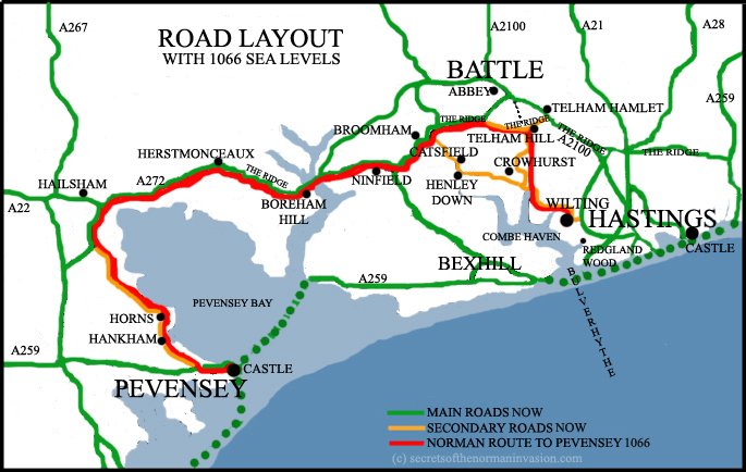 This shows in a simple visual format that the further away from the Wilting site the less the devastation of the manors took place. Wilting, Crowhurst and Broomham suffered the greatest devastation of all manors (full details in published work, but the reason for this was unknown in the past. The route chosen was the proposed route from Wilting to Pevensey using the surviving route around Pevensey Marsh. It became the coastal route prior to the development of the A259 in the Middle Ages.